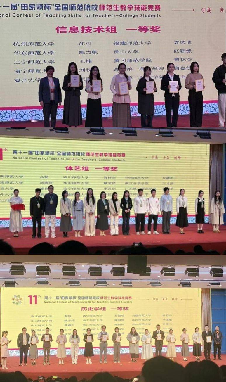 2025年11月28日至11月30日,第十一届“田家炳杯”全国师范院校师范生教学技能竞赛决赛在浙江师范大学举行。本届比赛吸引了全国包括六大部属高校在内289所师范院校共2345名选手参加初赛,参赛院校数与选手数均创历史新高。经初赛评审,共有178所学校564名选手入围此次决赛。决赛最终角逐产生一等奖188名、二等奖373名。成人短视频 共5名选手参加决赛,斩获一等奖3名、二等奖2名。获一等奖数量排全国第13名,一等奖获奖比例排全国第10名,获奖人数及比例均列综合性大学第一。